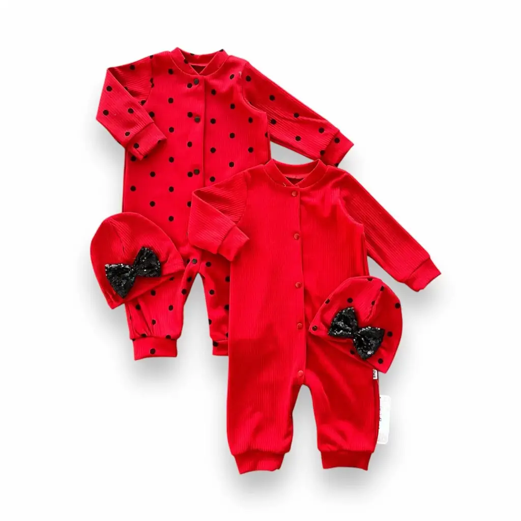 Omarı Puantiyeli Payetli Kız Bebek Tulumları Kırmızı 2 Li Kombin