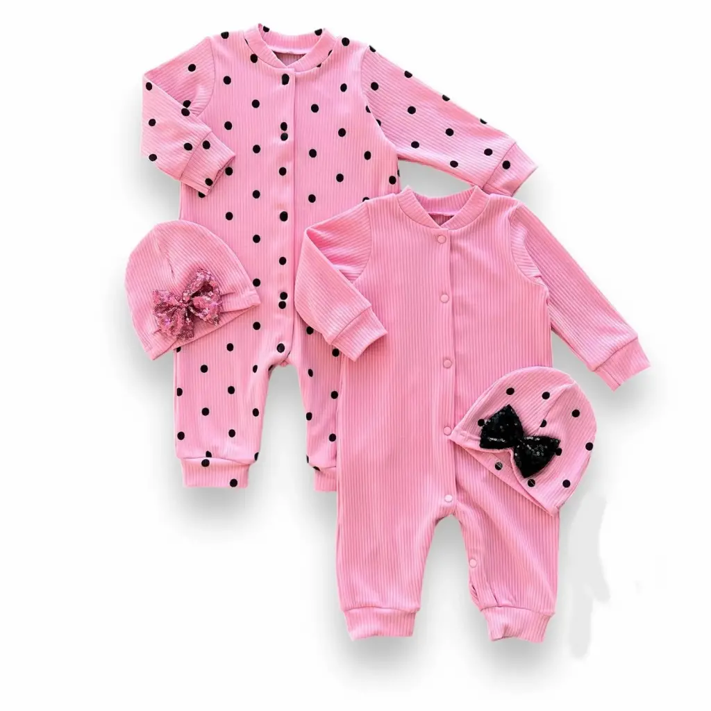 0-3 3-6 6-9 Ay Payetli Şapka Çıtçıt Kapamalı Puantiyeli Ve Düz 2 Li Kombin Kız Bebek Tulumları