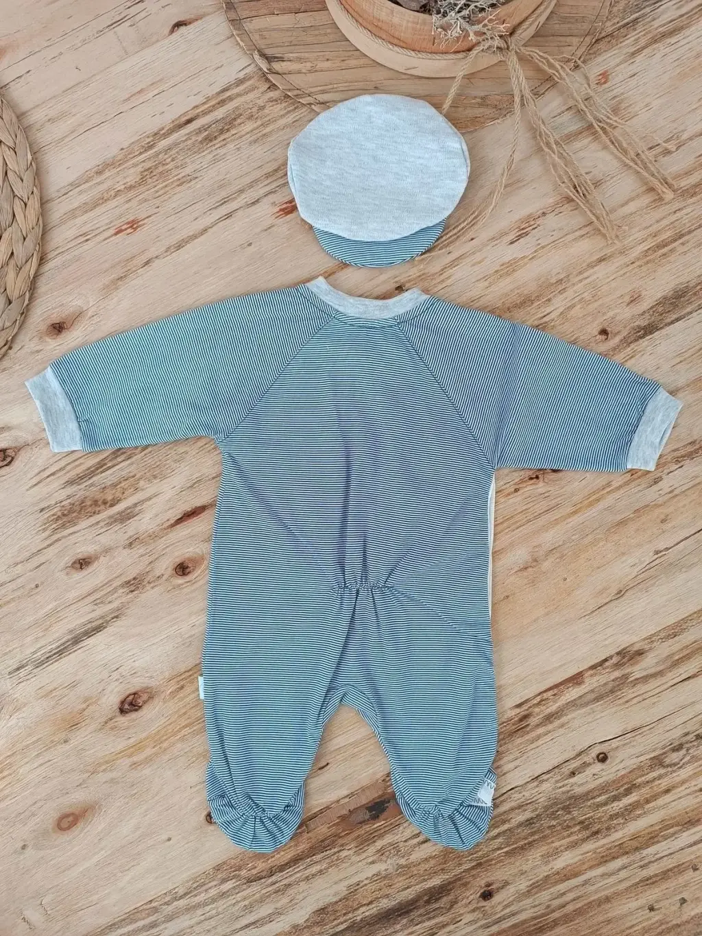 0-3 3-6 Ay Papyonlu Çizgi Desen Çıtçıt Kapama Kasketli Erkek Bebek Tulumu