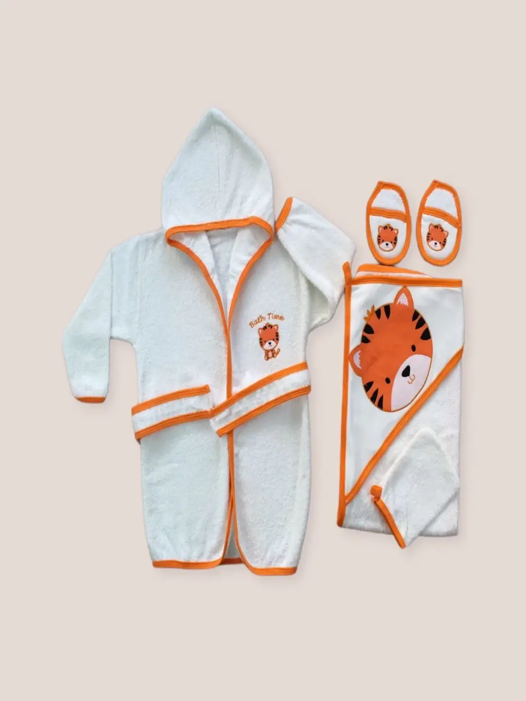 0-6 Ay Kaplan Nakışlı Bornozlu 5li Erkek Bebek Havlu Silgi Takımı