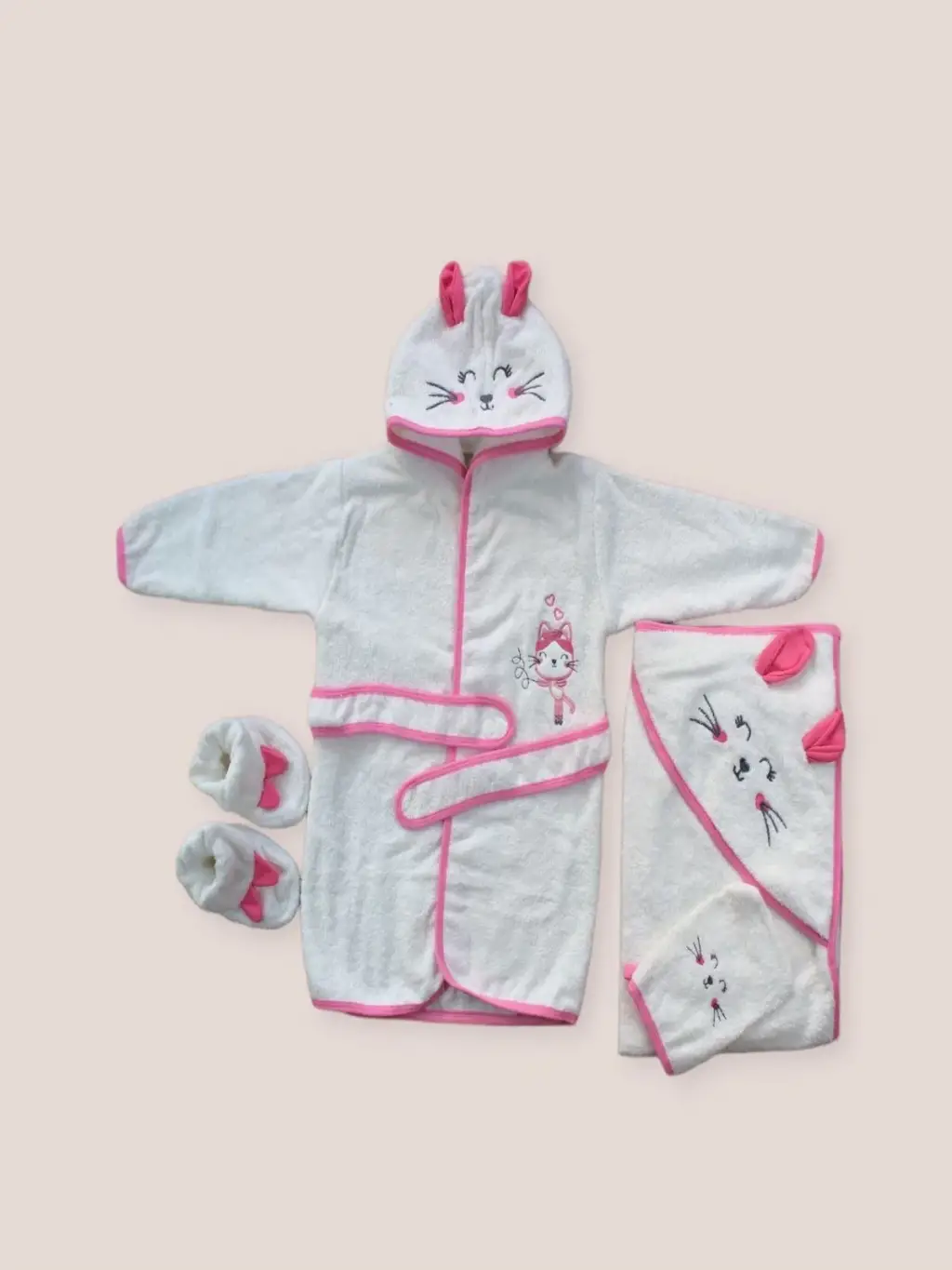 0-6 Ay Kedicik Nakışlı Bornozlu 5li Kız Bebek Havlu Silgi Takımı