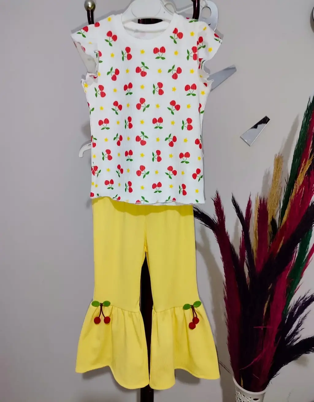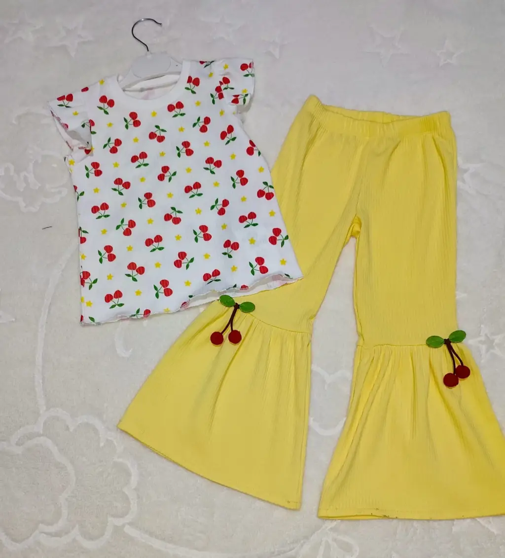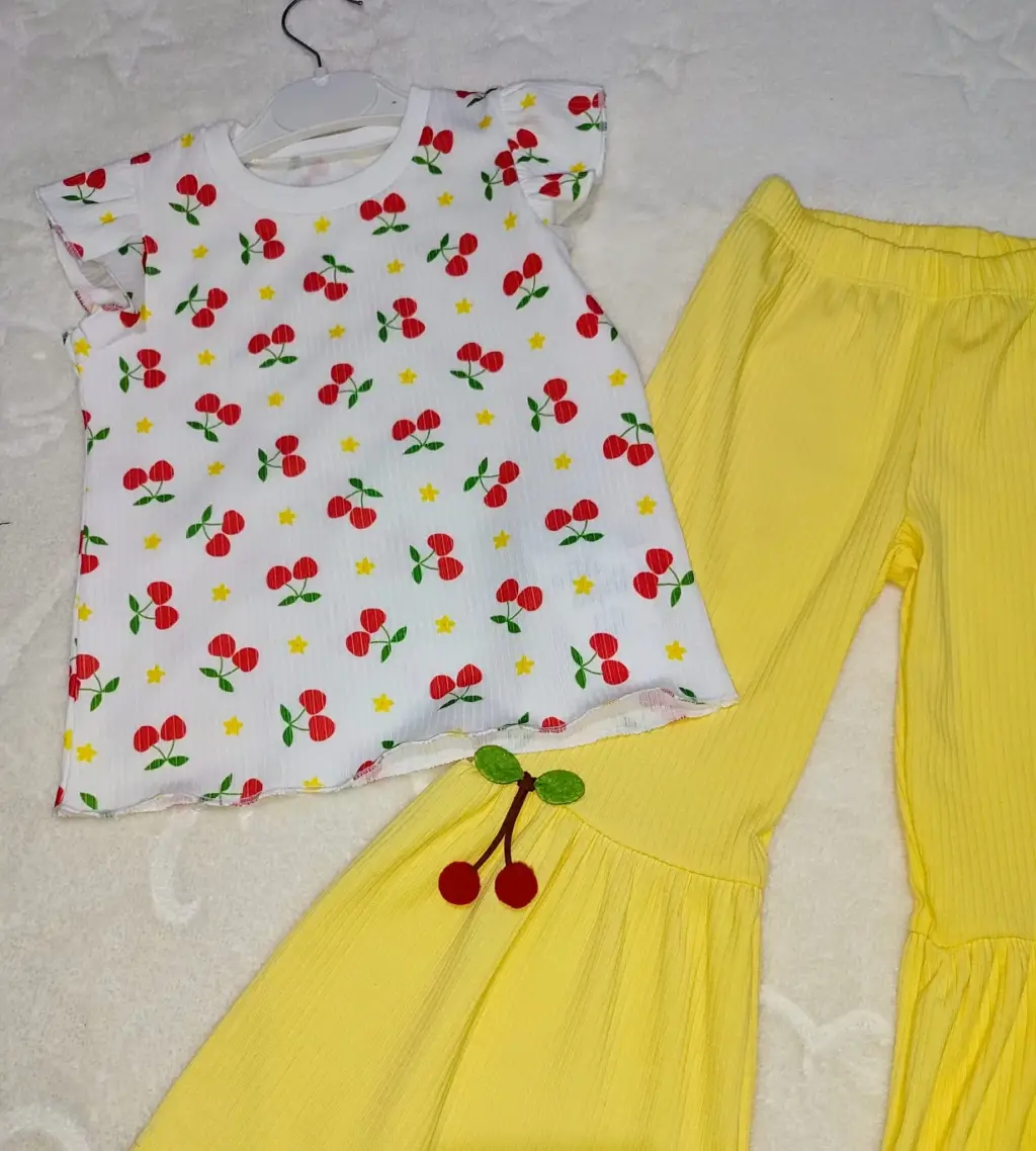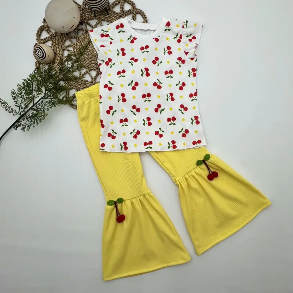 1-2-3-4 Yaş Kiraz Baskılı Tişört İspanyol Paçalı Likralı 2li Kız Çocuk Takımı Sarı