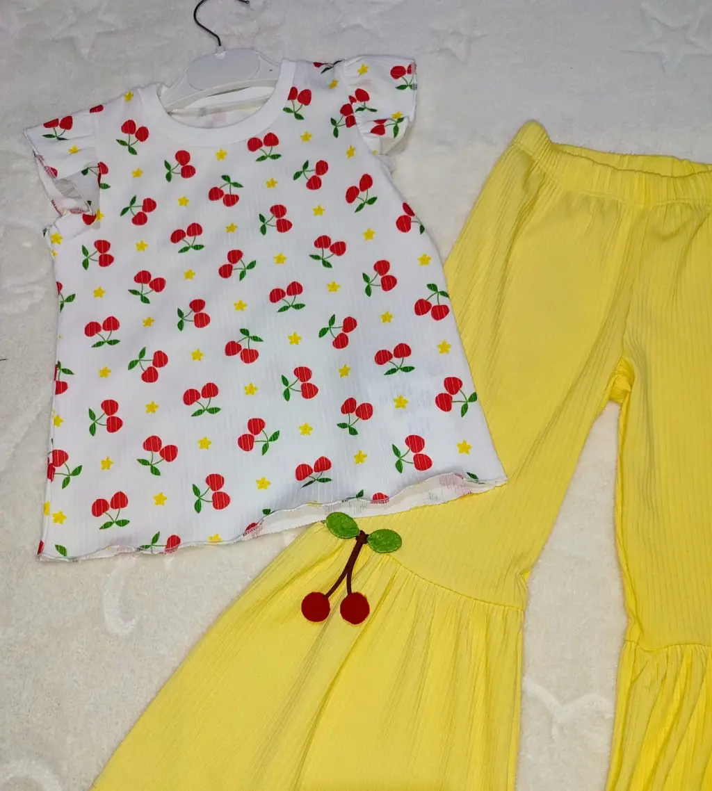 1-2-3-4 Yaş Kiraz Baskılı Tişört İspanyol Paçalı Likralı 2li Kız Çocuk Takımı