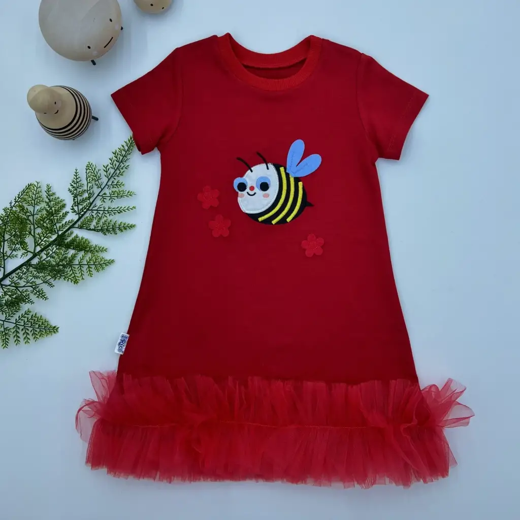 Omarı Sevimli Arıcık Nakışlı Kırmızı Fırfırlı Bebek Elbisesi