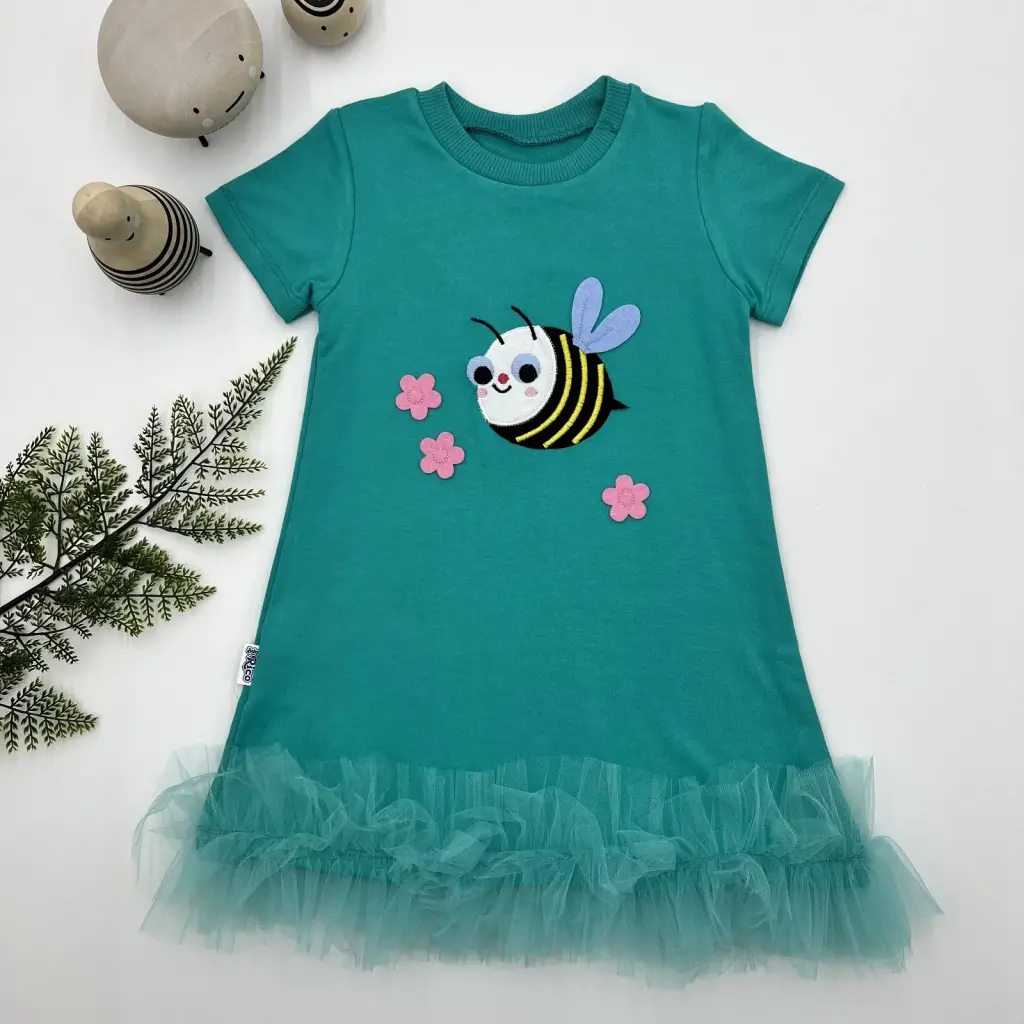 1-2-3 Yaş Arıcık Nakışlı Eteği Fırfırlı Jile Kız Çocuk Elbisesi