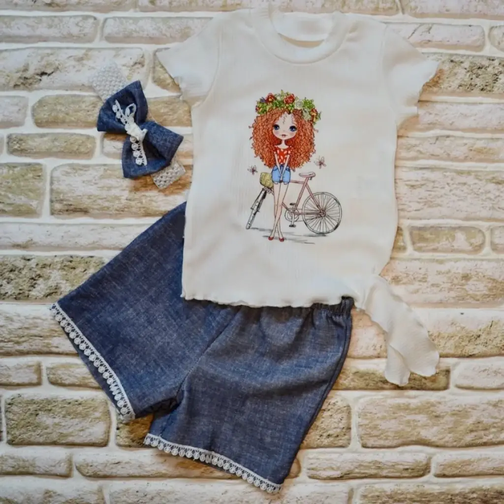 1-2-3 Yaş Bisikletli Kız Baskılı Bandanalı Kot Desenli Şort Kısa Kollu Tişört 3lü Kız Bebek Takımı