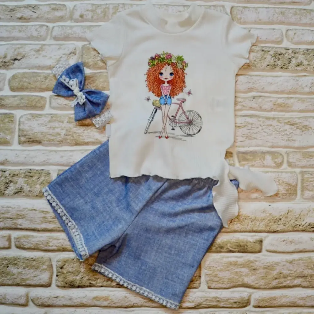 1-2-3 Yaş Bisikletli Kız Baskılı Bandanalı Kot Desenli Şort Kısa Kollu Tişört 3lü Kız Bebek Takımı