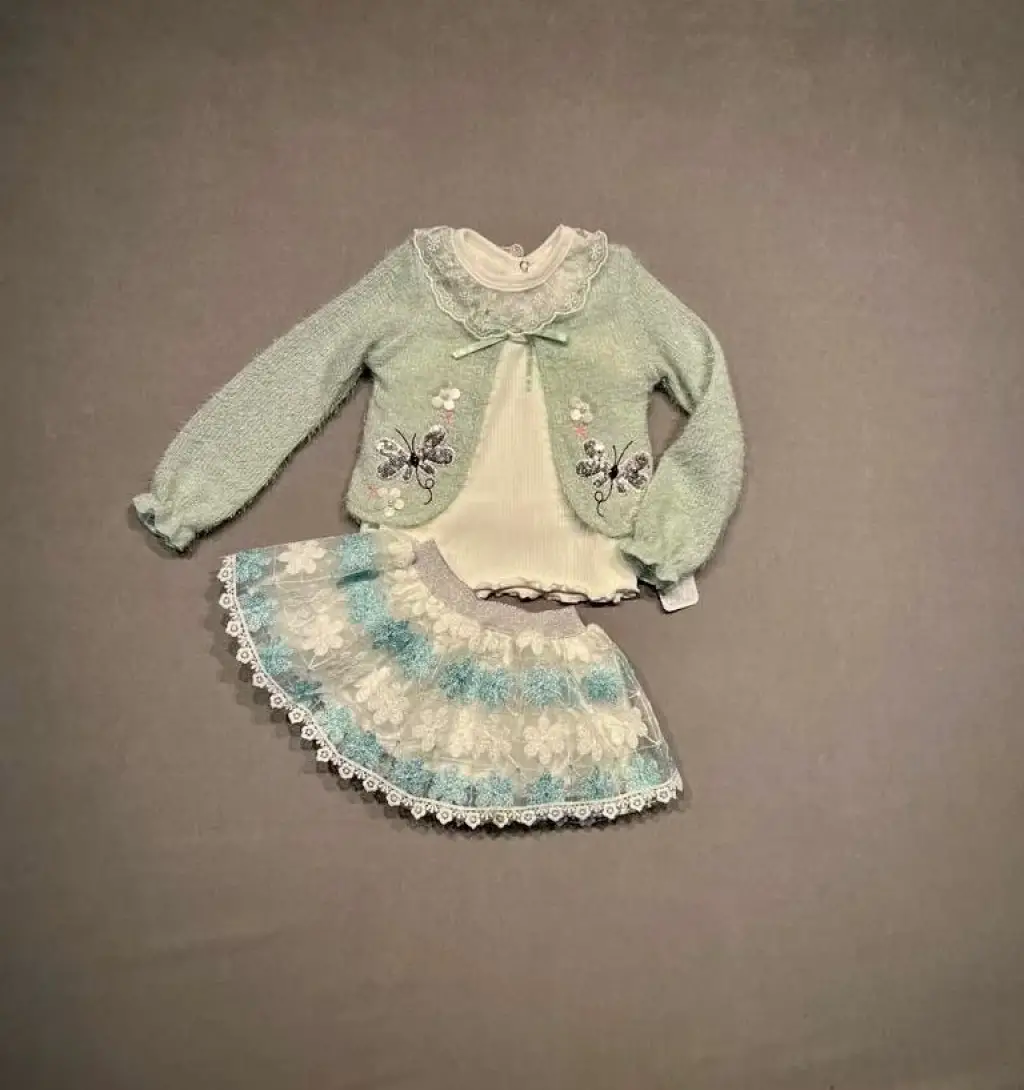 1-2-3 Yaş Brode Etekli Örme Hırkalı Uzun Kollu Sweat 3lü Kız Çocuk Takımı