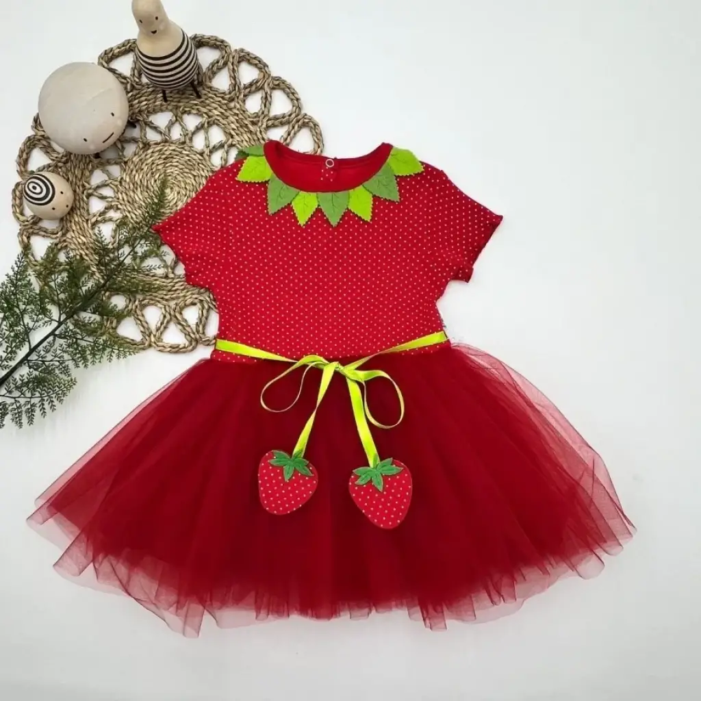 Tütü Elbise Çilek Desenli Kırmızı Kız Bebek