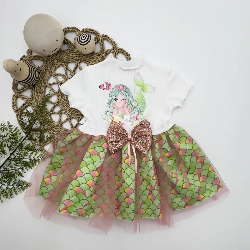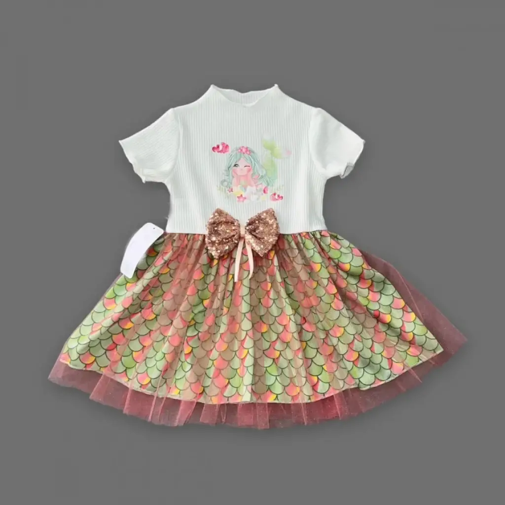 1-2-3 Yaş Denizkızı Baskılı Pul Desen Etekli Kız Bebek Elbisesi