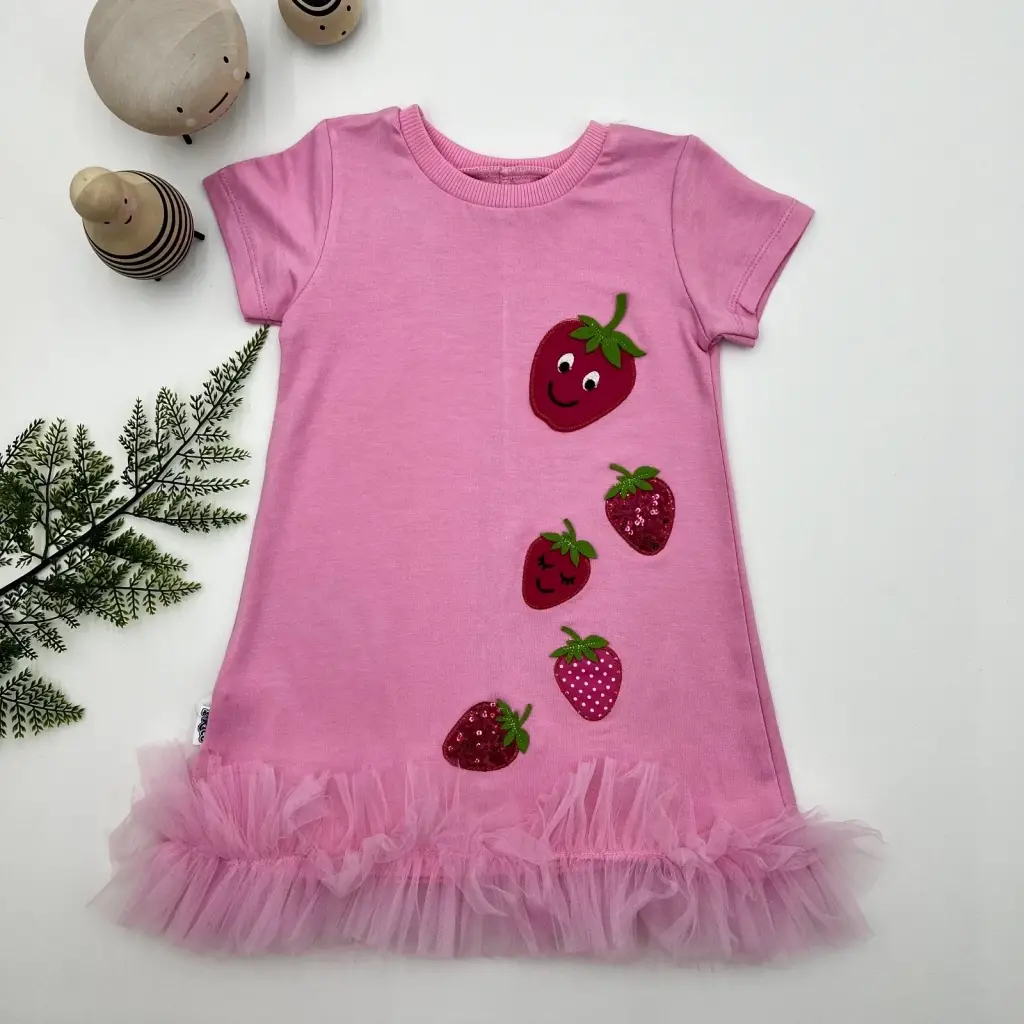 1-2-3 Yaş Payetli Çilekler Nakışlı Eteği Fırfırlı Jile Kız Çocuk Elbisesi