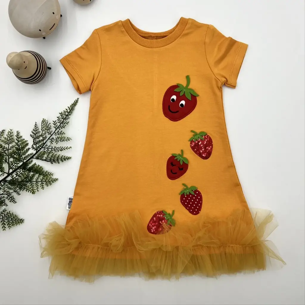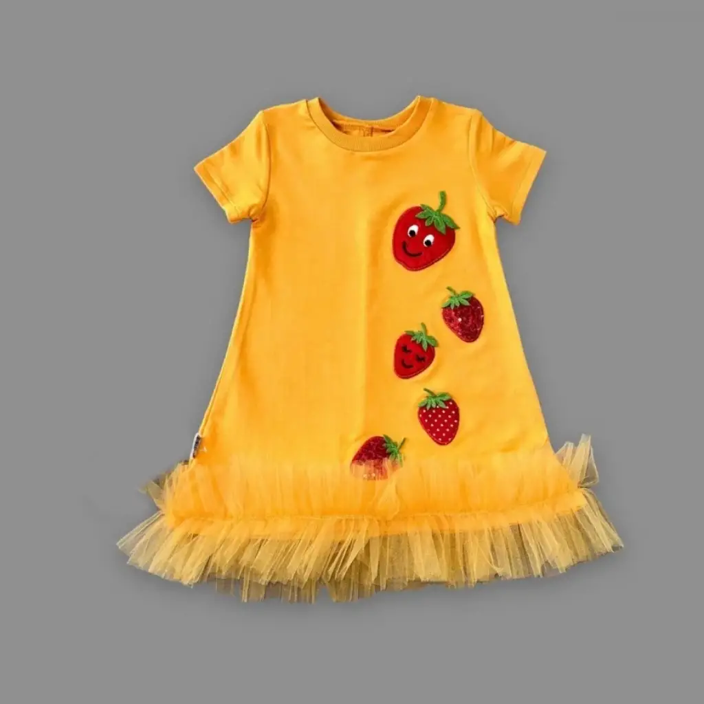 1-2-3 Yaş Payetli Çilekler Nakışlı Eteği Fırfırlı Jile Kız Çocuk Elbisesi