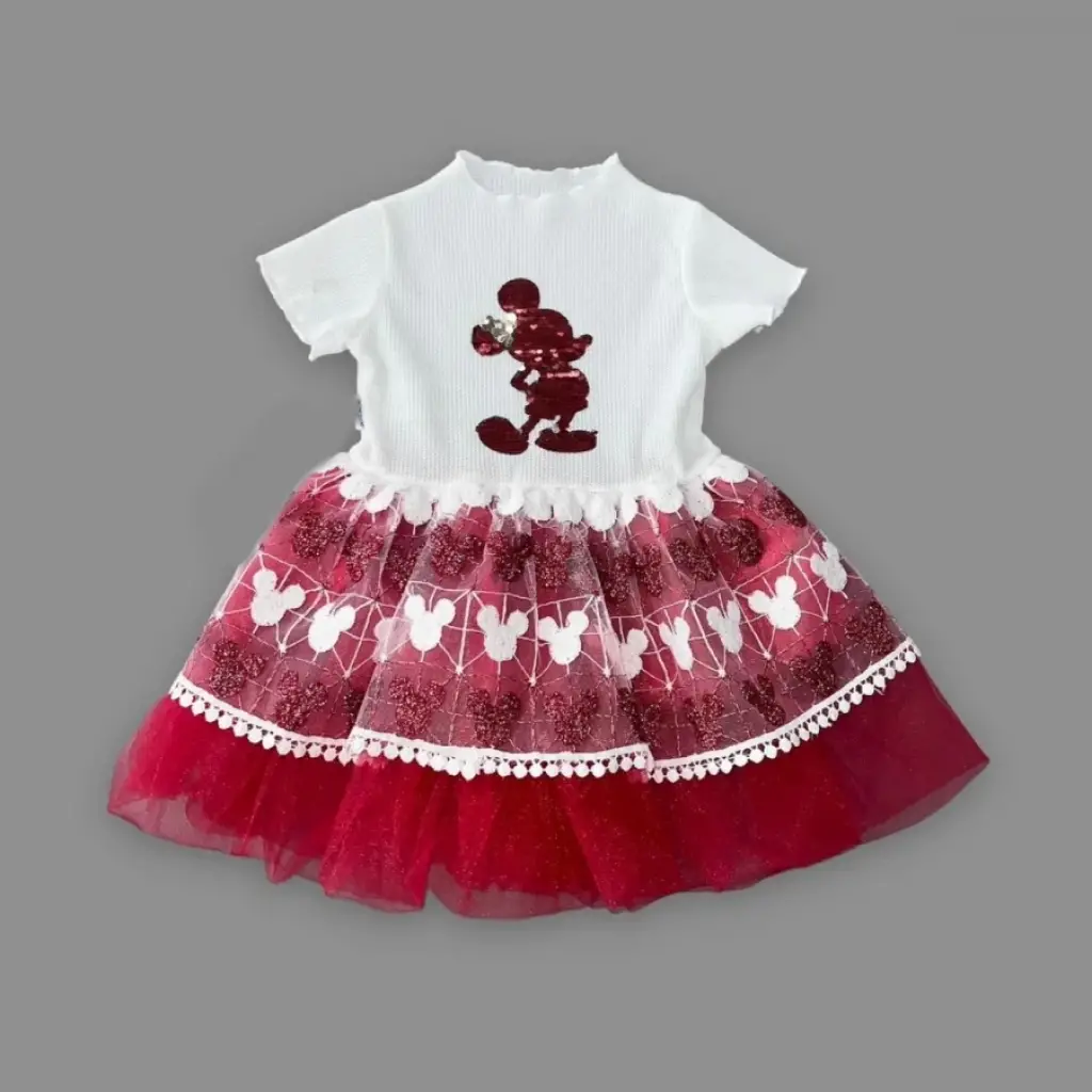 1-2-3 Yaş Payetli Mickey Baskılı Brode Etekli Kız Bebek Elbisesi