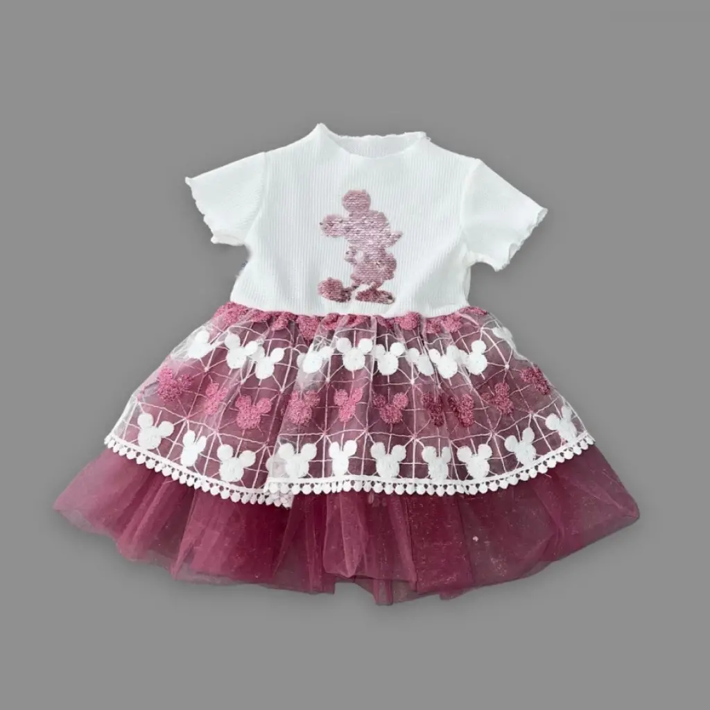 1-2-3 Yaş Payetli Mickey Baskılı Brode Etekli Kız Bebek Elbisesi
