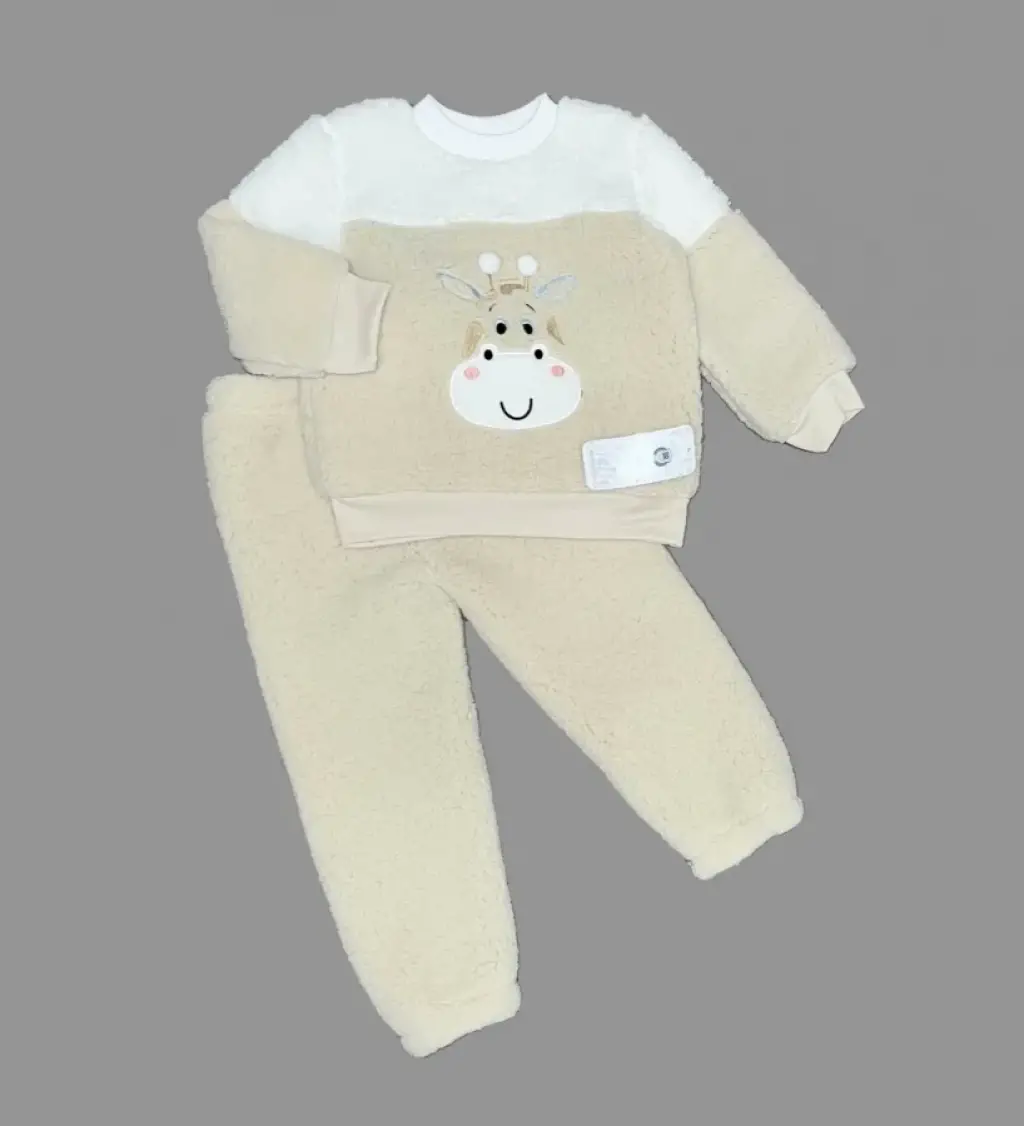 1-2-3 Yaş Ponponlu Zürafa Desenli Kuzu Kumaş Uzun Kollu 2li Kız Erkek Çocuk Takımı