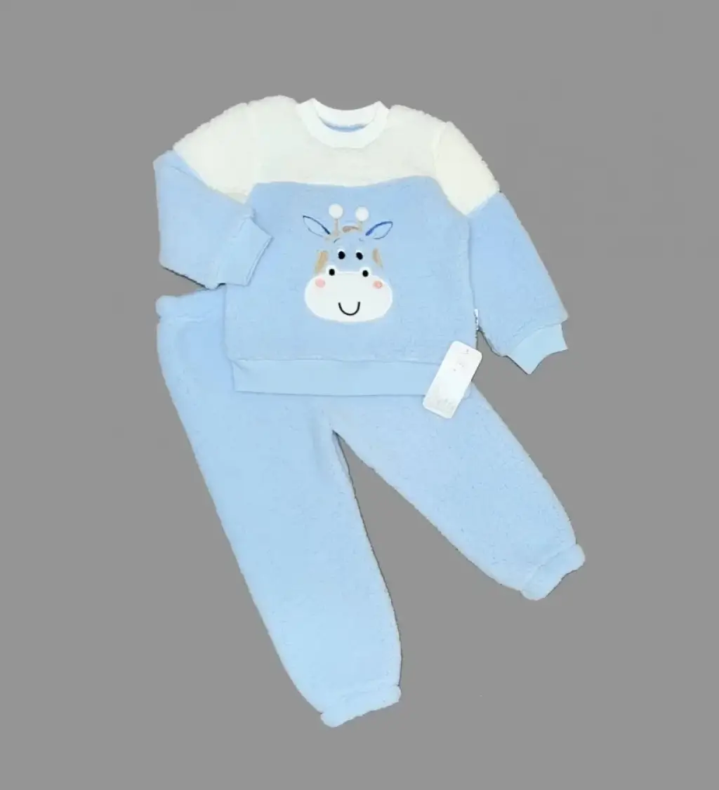 1-2-3 Yaş Ponponlu Zürafa Desenli Kuzu Kumaş Uzun Kollu 2li Kız Erkek Çocuk Takımı