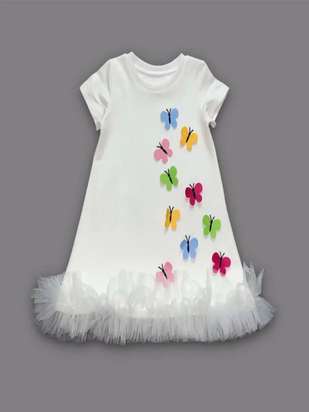 1-2-3 Yaş Renkli Kelebekler Nakışlı Eteği Fırfırlı Jile Çocuk Elbisesi