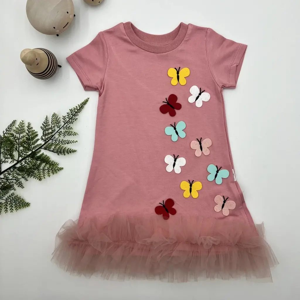 Çocuk Elbisesi Fırfırlı Kelebekler Nakışlı Jile