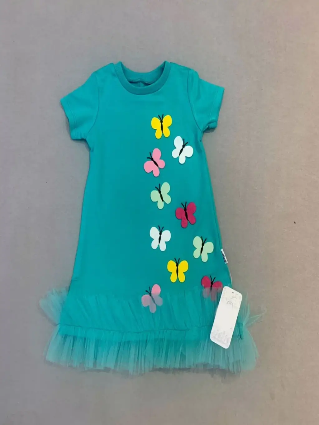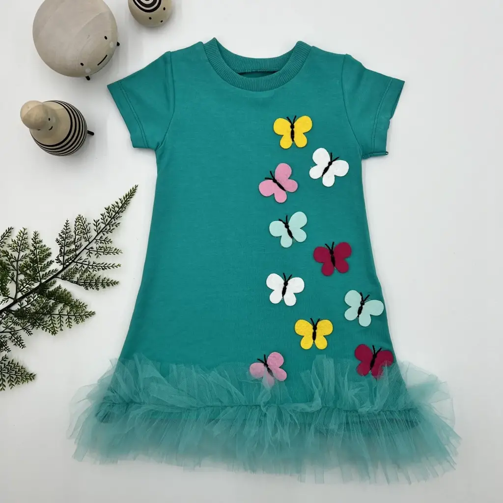 1-2-3 Yaş Renkli Kelebekler Nakışlı Eteği Fırfırlı Jile Çocuk Elbisesi