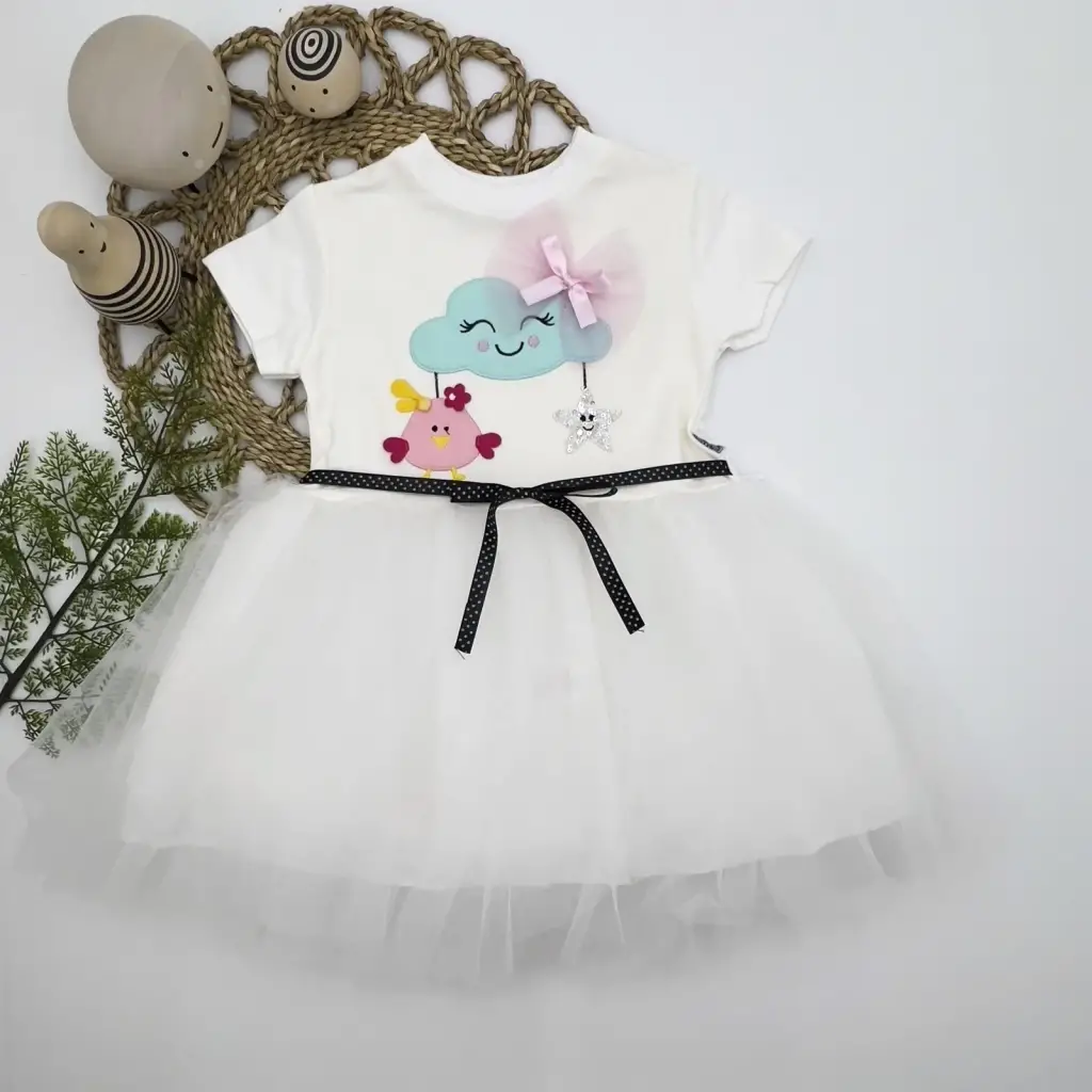 1-2-3 Yaş Tül Tokalı Bulut Civciv Ve Yıldız Nakışlı Kız Bebek Elbisesi