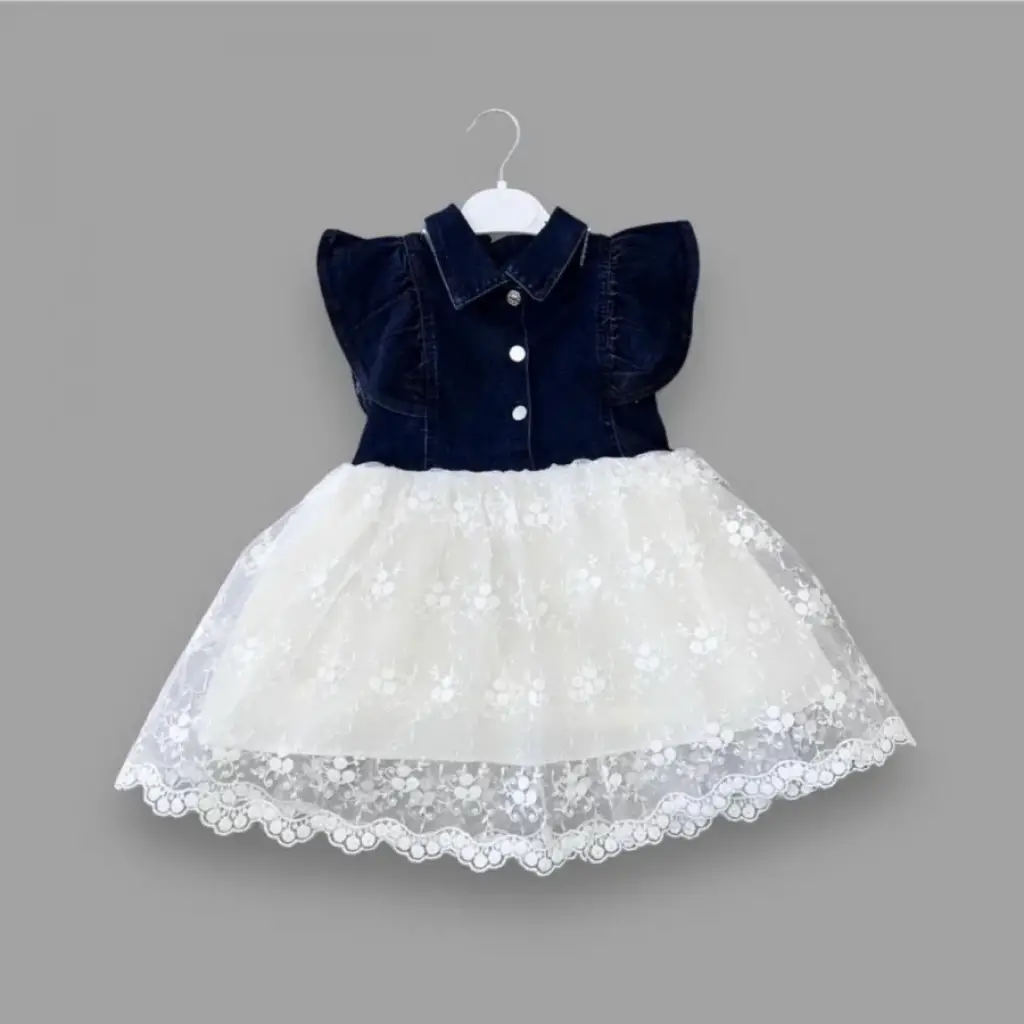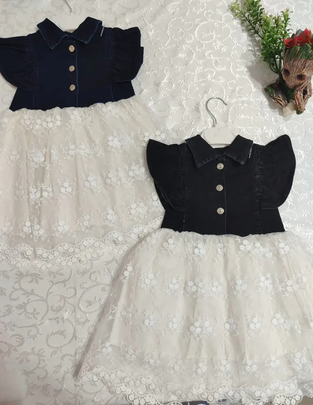 2-3-4 Yaş Astarlı Brode Etekli Kot Kumaş Düğmeli Kız Çocuk Elbisesi