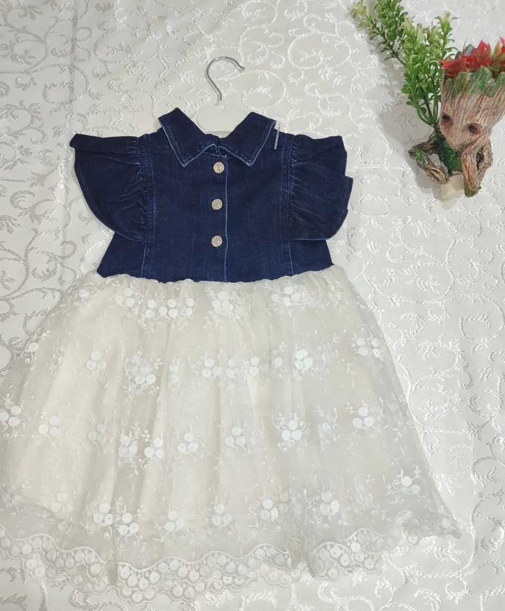 2-3-4 Yaş Astarlı Brode Etekli Kot Kumaş Düğmeli Kız Çocuk Elbisesi