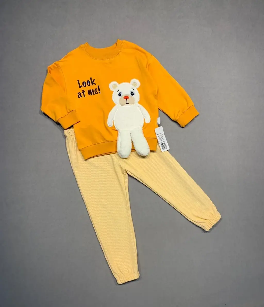 2-3-4 Yaş Ayıcık Sallanan Ayak Desenli Likra Penye Kumaş Sweat Pantolonlu Kız Erkek 2li Çocuk Takımı