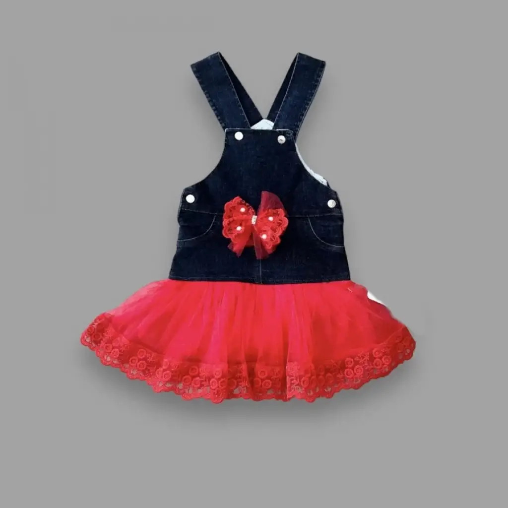 2-3-4 Yaş Fiyonklu Düğme Detaylı Tül Etek Kot Kumaş Salopet Kız Çocuk Elbisesi