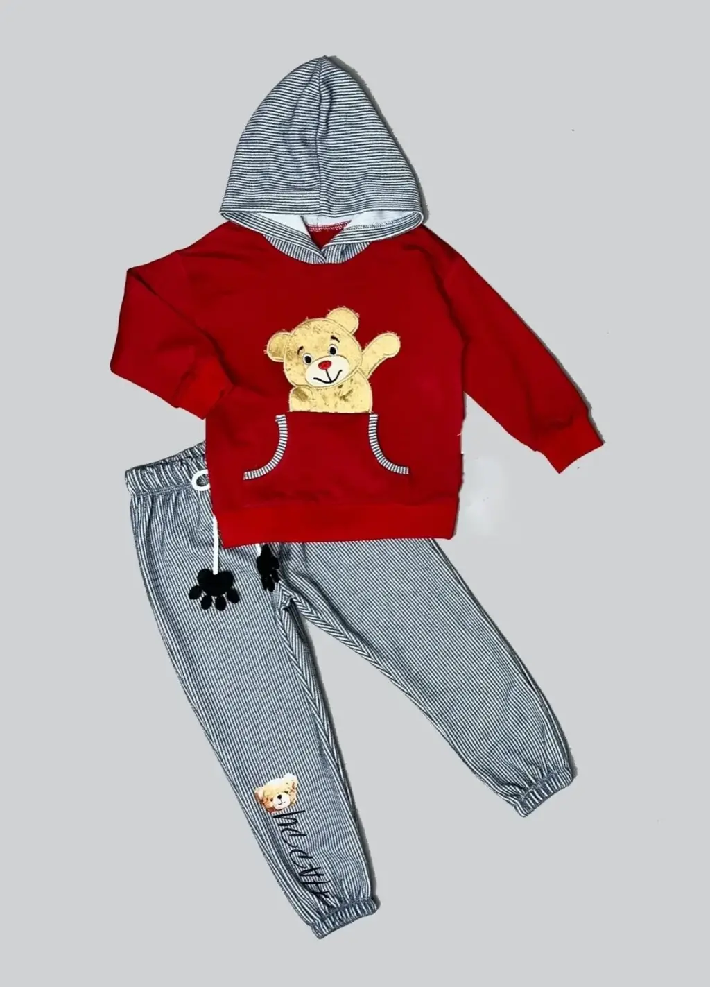 2-3-4 Yaş Pelüş Ayı Desenli Kapşonlu Uzun Kollu Penye Sweat 2li Erkek Çocuk Takımı