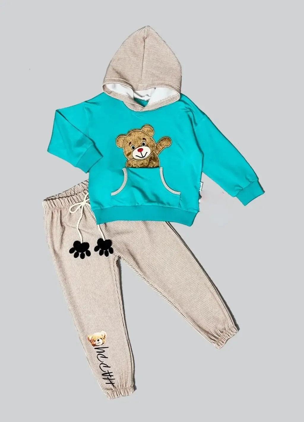 2-3-4 Yaş Pelüş Ayı Desenli Kapşonlu Uzun Kollu Penye Sweat 2li Erkek Çocuk Takımı