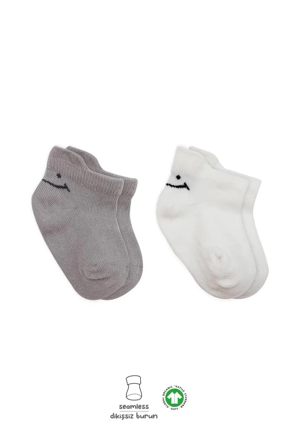 Omarı 2'li Penye Çorap Seti Gri Ekru Smile Desenli