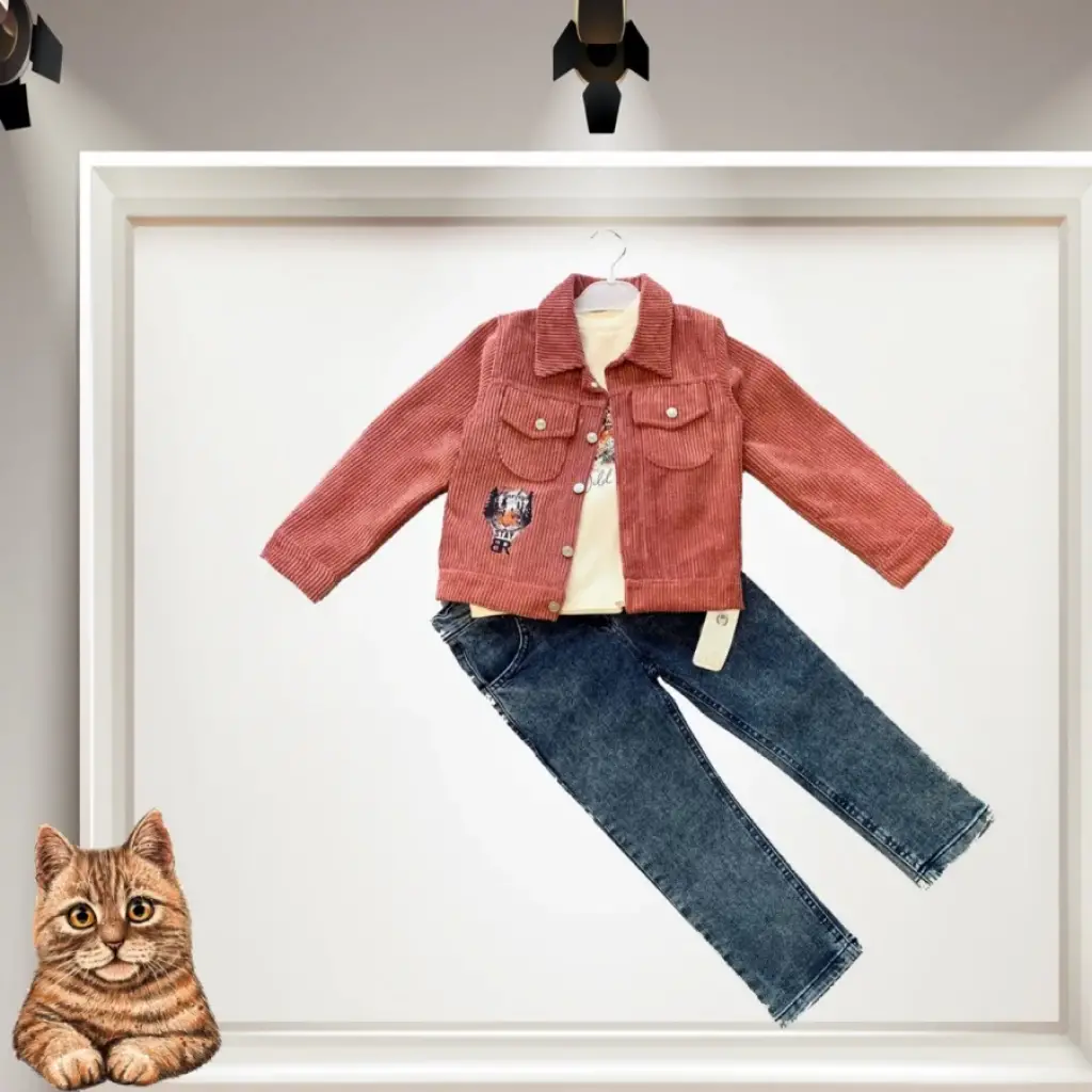 3-4-5 Yaş Fitilli Kadife Ceket Kot Pantolonlu 3lü Kız Erkek Çocuk Takımı