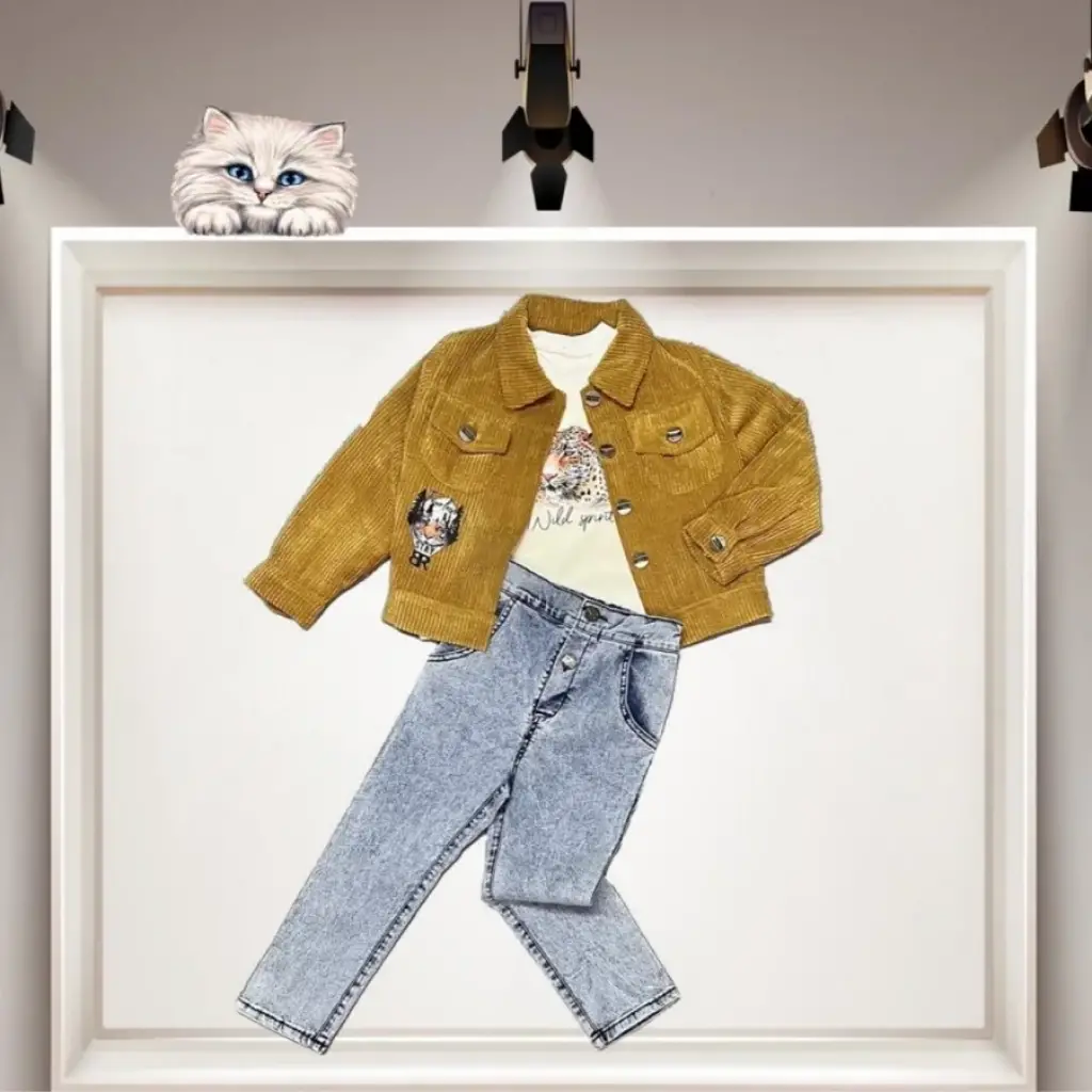 3-4-5 Yaş Fitilli Kadife Ceket Kot Pantolonlu 3lü Kız Erkek Çocuk Takımı