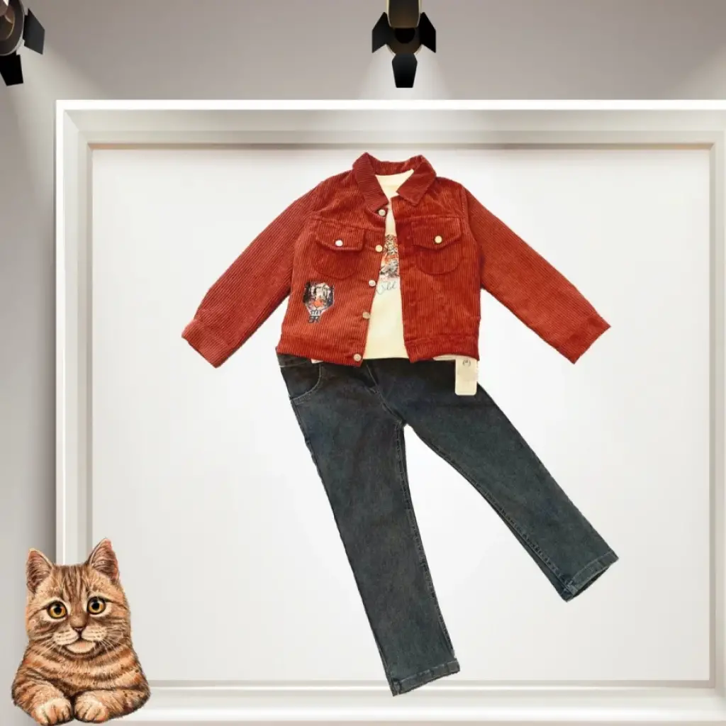 3-4-5 Yaş Fitilli Kadife Ceket Kot Pantolonlu 3lü Kız Erkek Çocuk Takımı