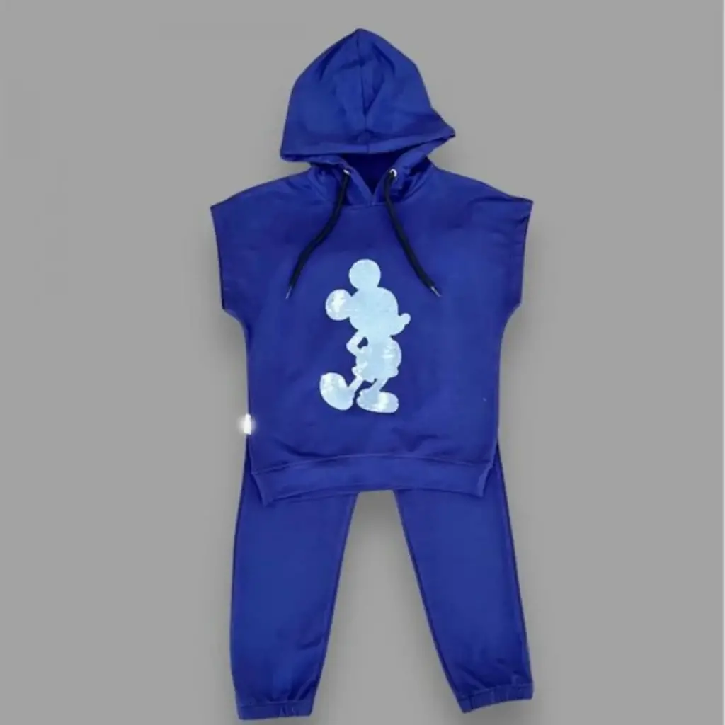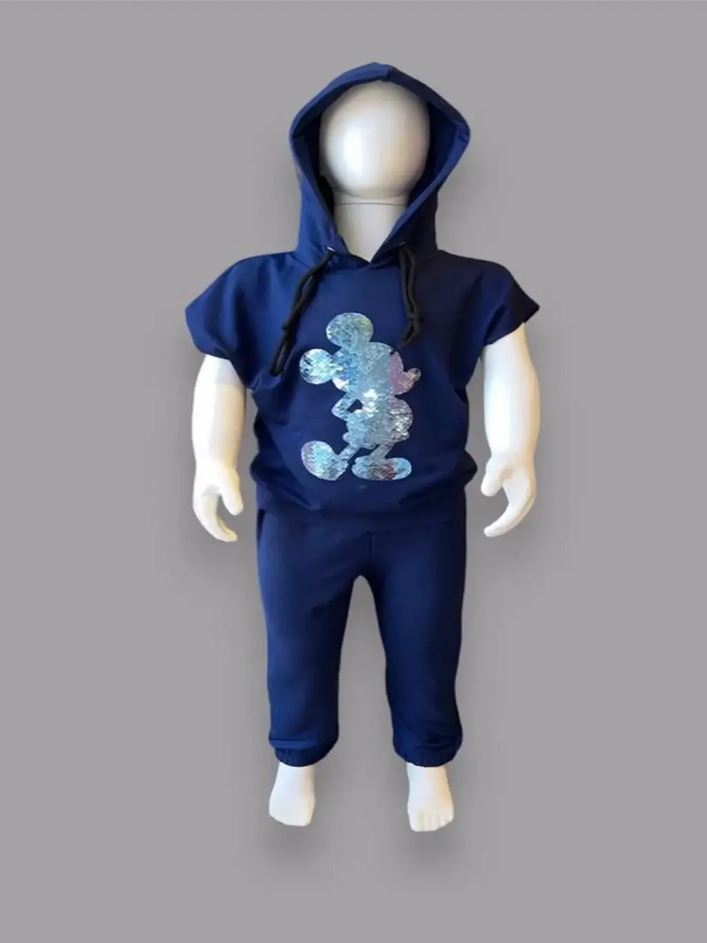 3-4-5 Yaş Kapşonlu Payetli Mickey Desenli Kısa Kol 2li Kız Erkek Çocuk Takımı