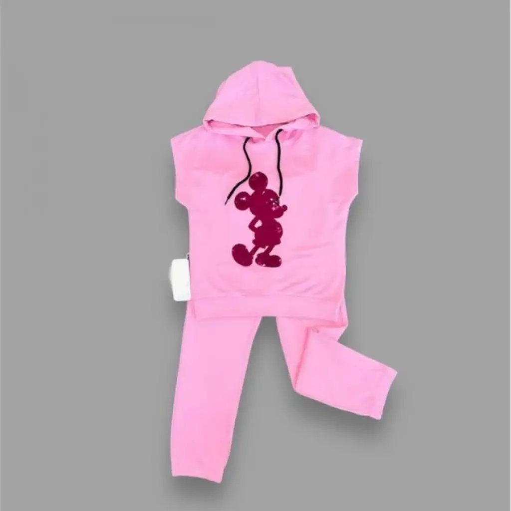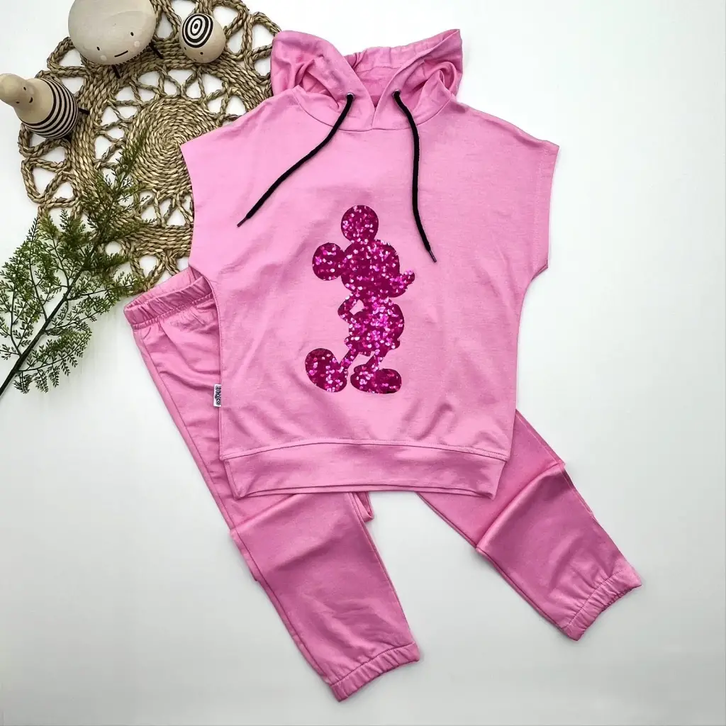 3-4-5 Yaş Kapşonlu Payetli Mickey Desenli Kısa Kol 2li Kız Erkek Çocuk Takımı