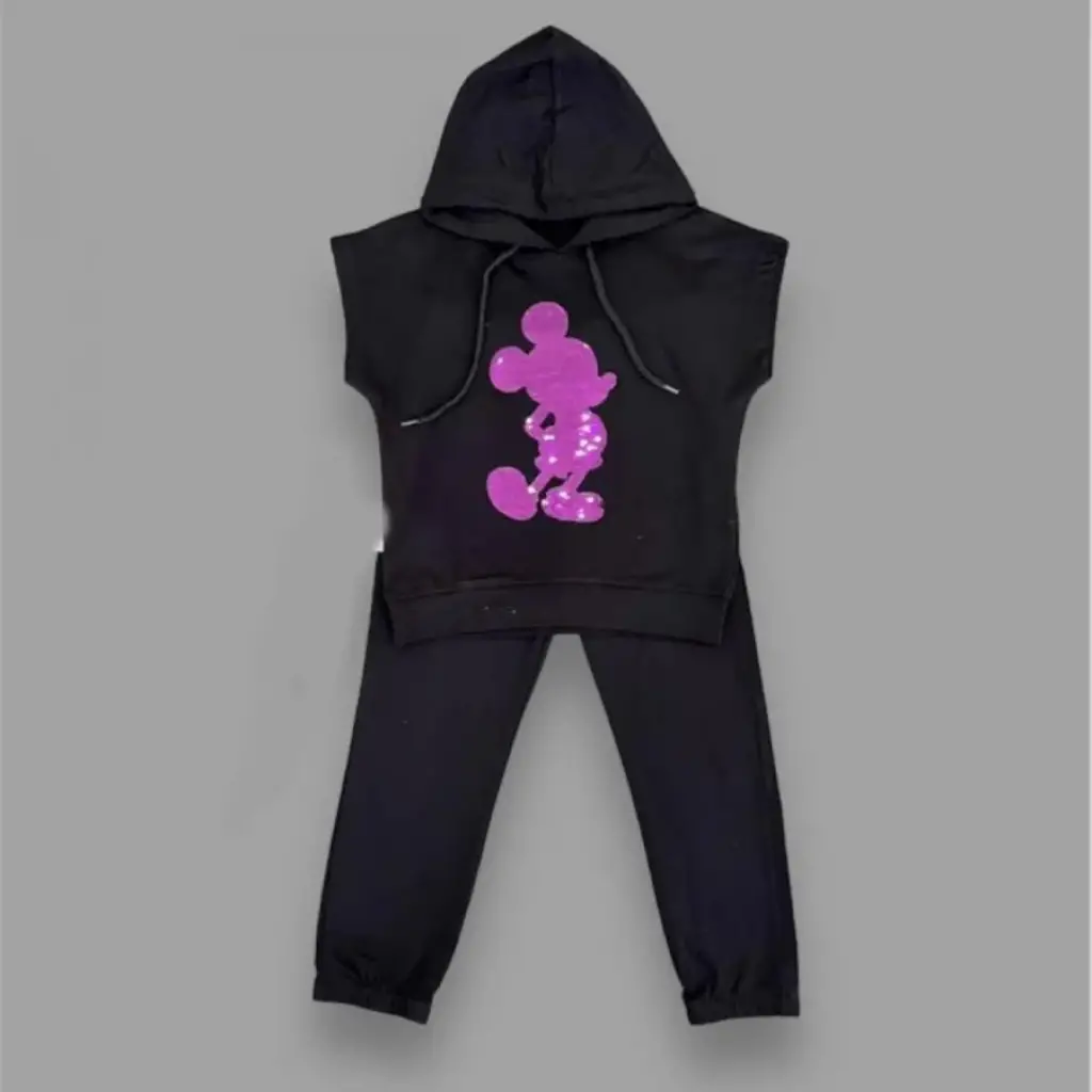 3-4-5 Yaş Kapşonlu Payetli Mickey Desenli Kısa Kol 2li Kız Erkek Çocuk Takımı