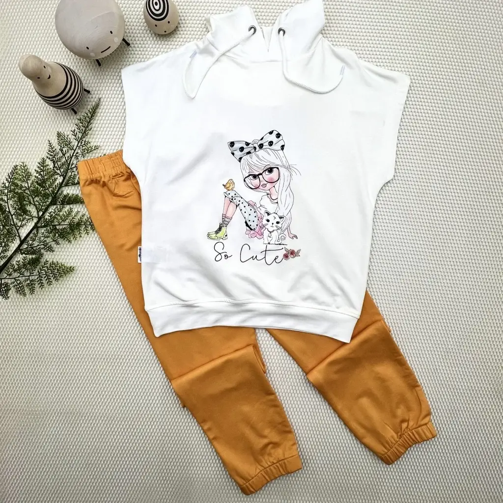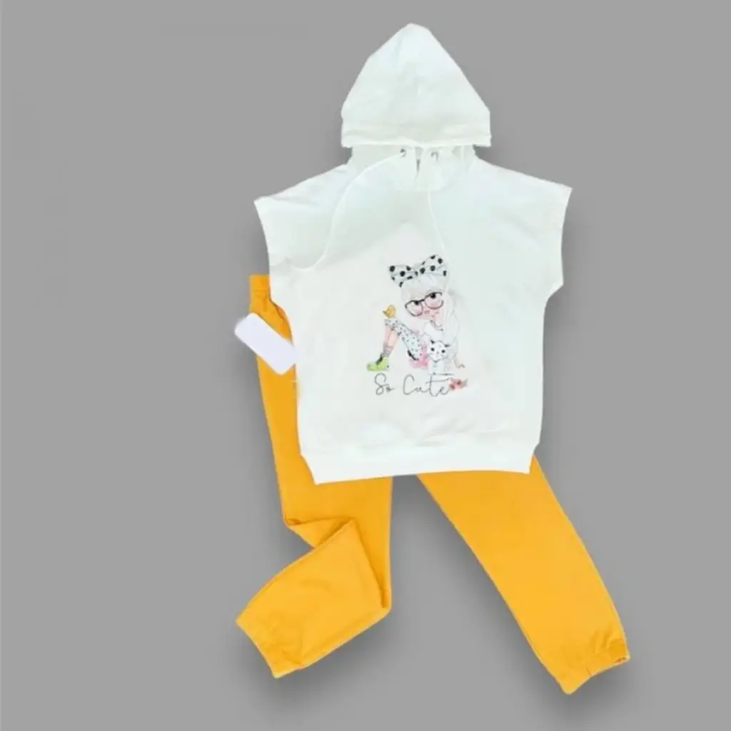 3-4-5 Yaş Kapşonlu Sevimli Kız Baskılı Kısa Kolu 2li Kız Erkek Çocuk Takımı