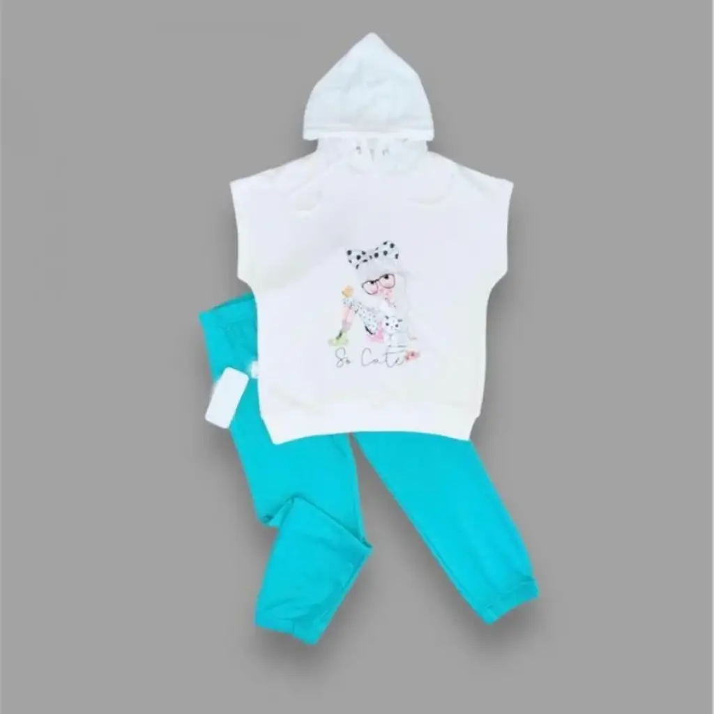 Zarif Kapşonlu Baskılı Çocuk Takımı Turkuaz