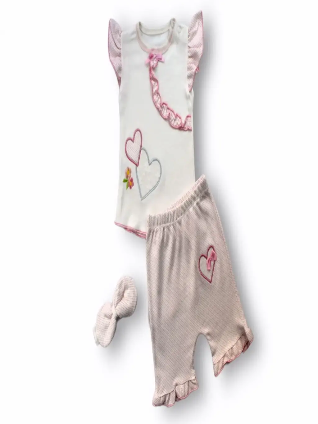 3-6 6-9 9-12 12-18 Ay Çift Kalp Nakışlı Şort Tişört 3lü Kız Bebek Takımı