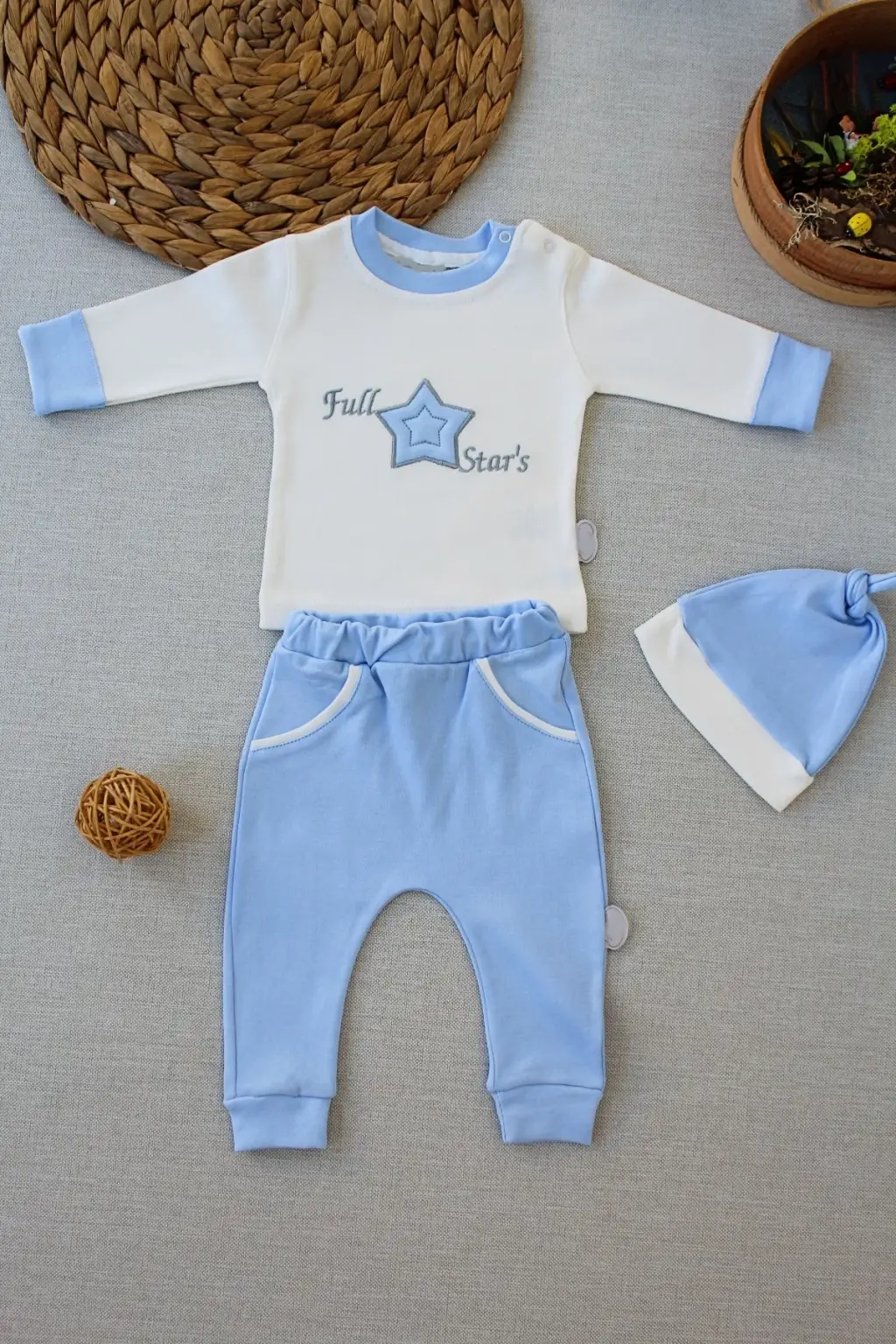 3-6 6-9 9-12 Ay Full b Nakışlı Şapkalı Uzun Kollu Sweat 3lü Erkek Bebek Takımı