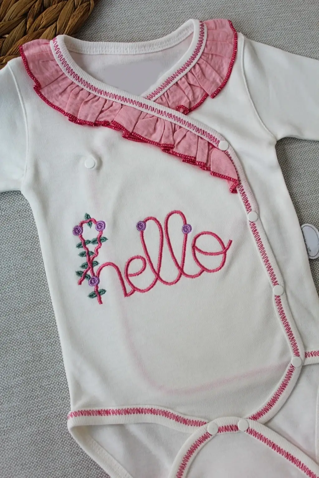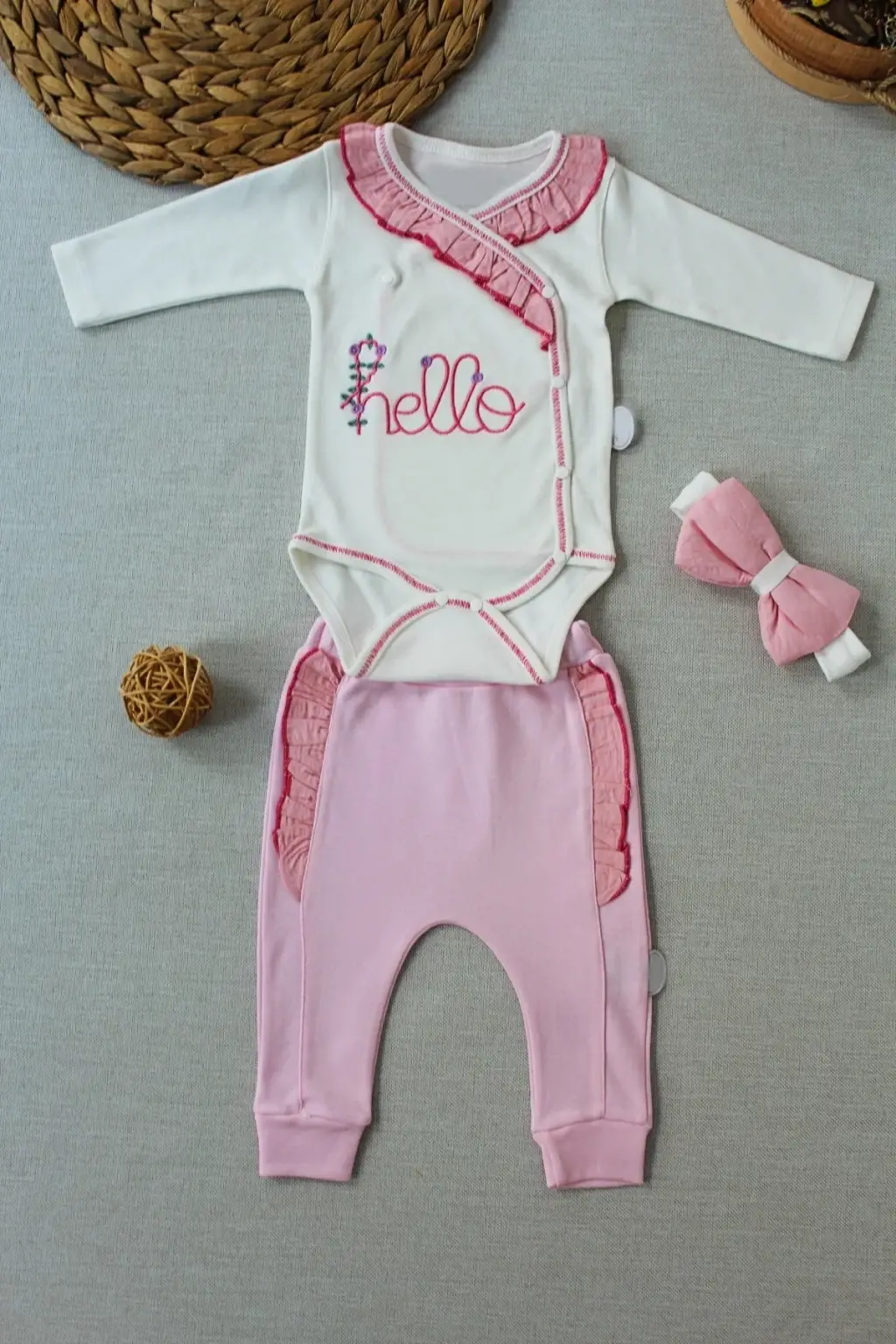 3-6 6-9 9-12 Ay Hello Nakışlı Kruvaze Bandanalı Uzun Kollu Zıbınlı 3lü Kız Bebek Takımı