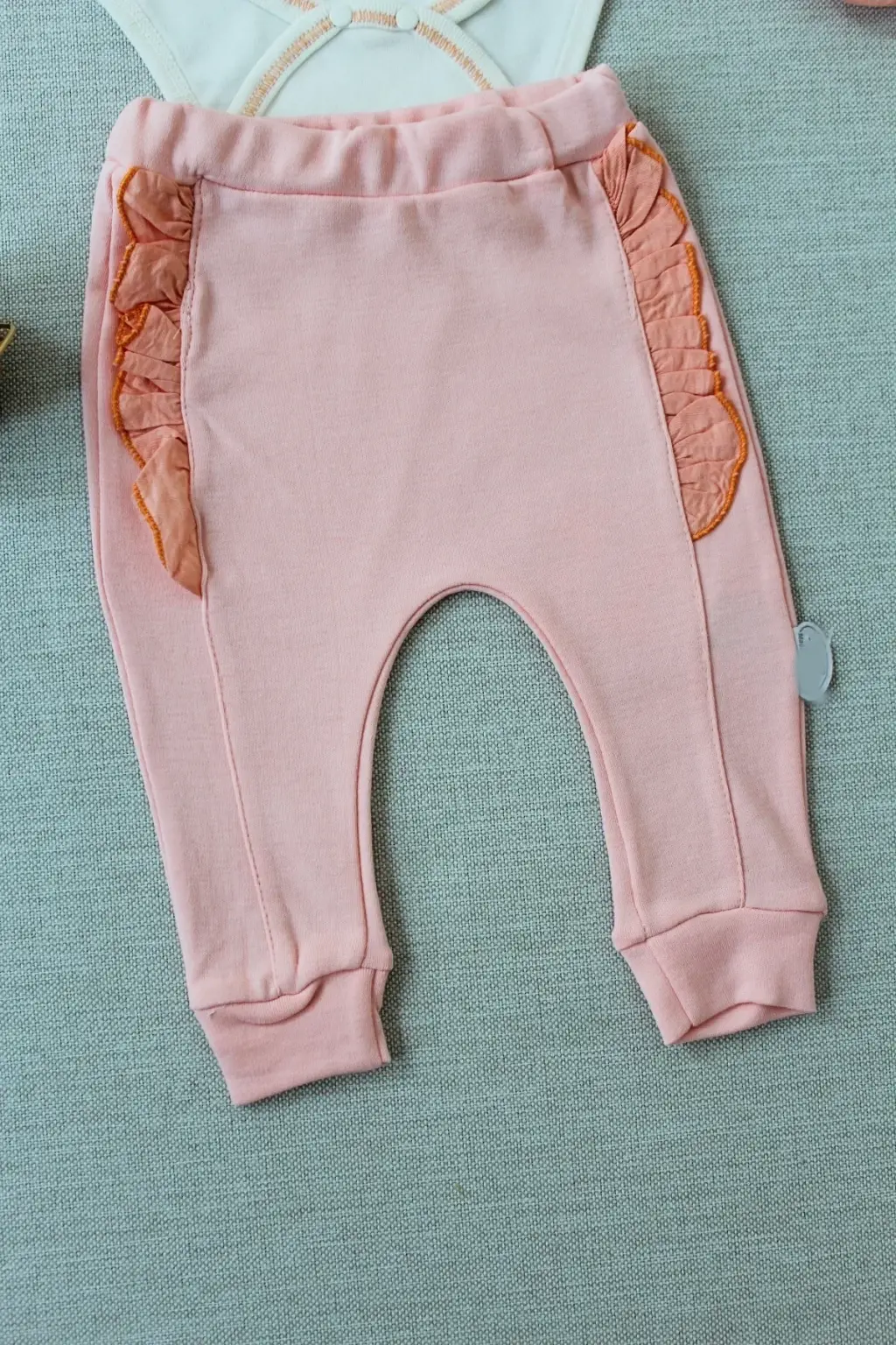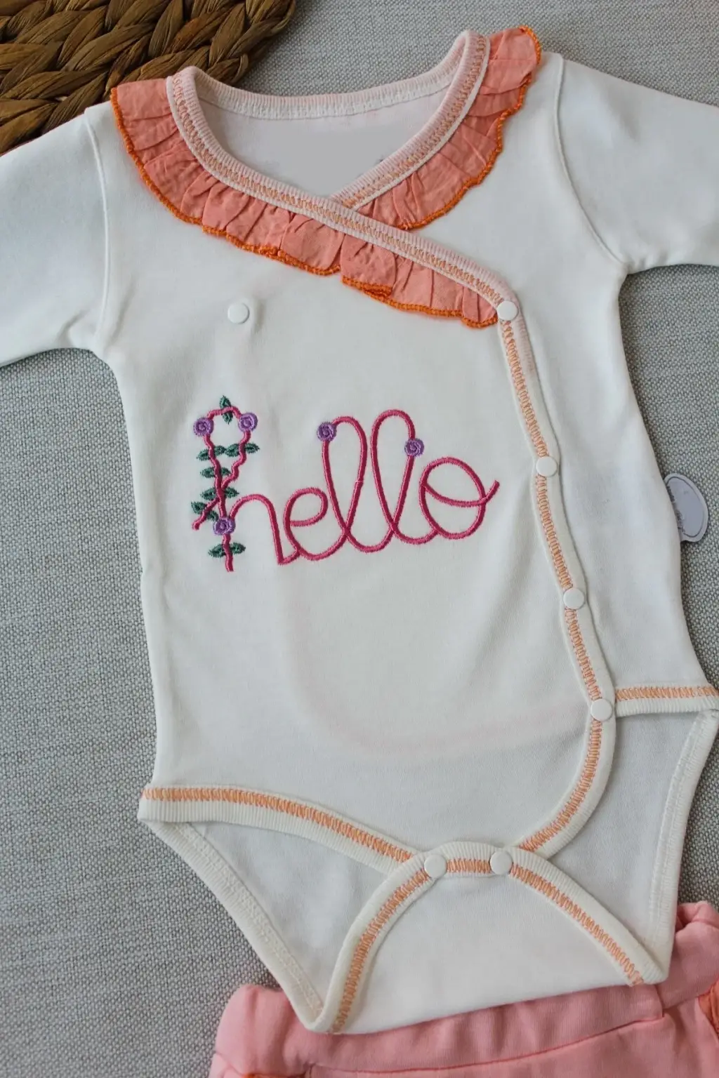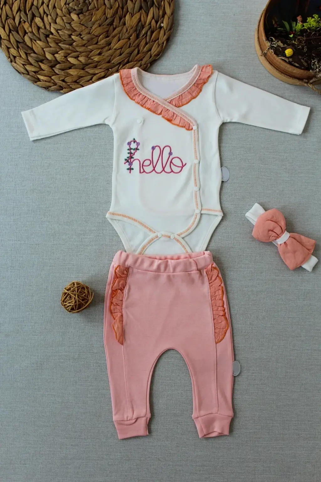 3-6 6-9 9-12 Ay Hello Nakışlı Kruvaze Bandanalı Uzun Kollu Zıbınlı 3lü Kız Bebek Takımı