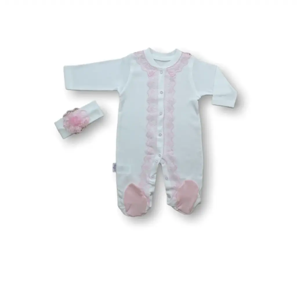 Zarif Dantelli Bandanalı Uzun Kollu Kız Bebek Tulumu