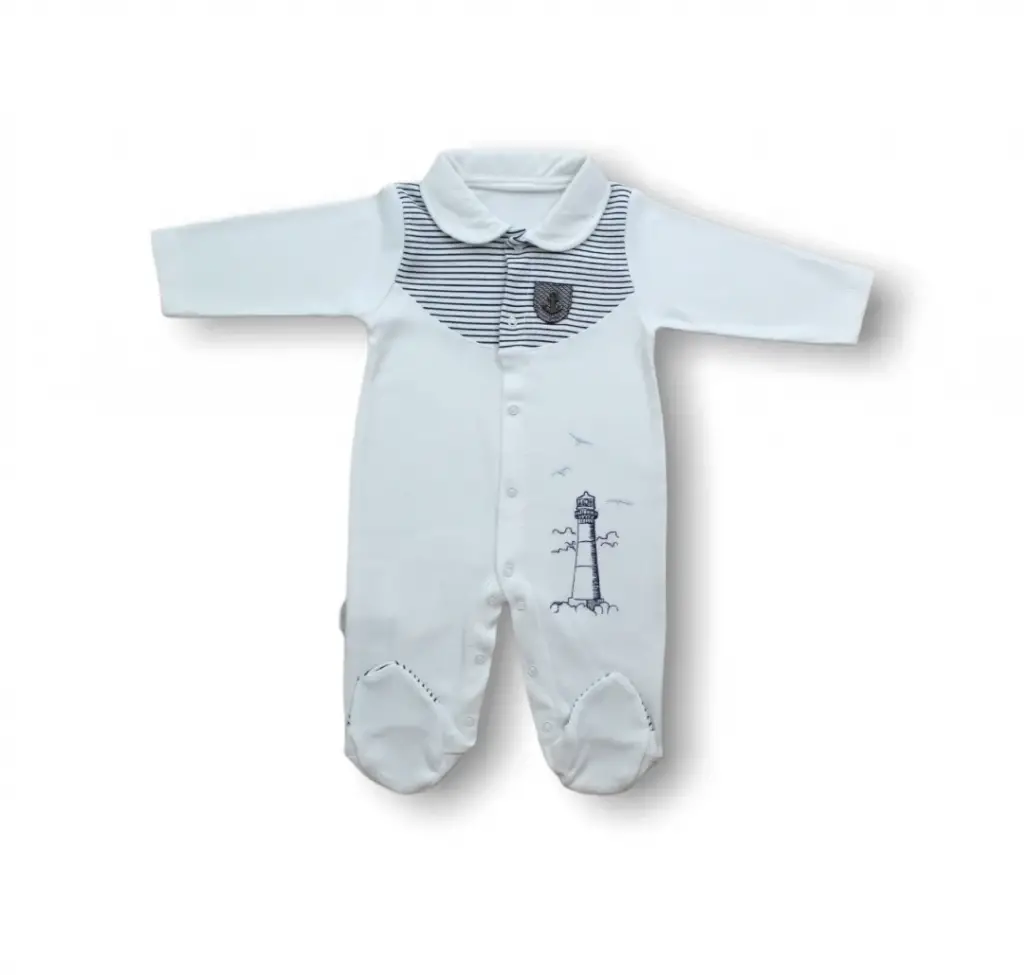 3-6 6-9 Ay Deniz Feneri Nakışlı Patikli Uzun Kollu Erkek Bebek Tulumu