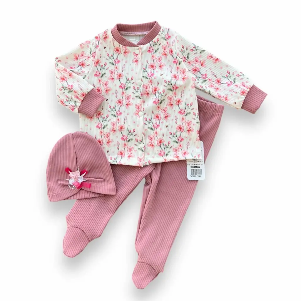3-6-9-12 Ay Çiçek Baskılı Şapkalı Çıtçıt Kapamalı Patikli 3lü Kız Bebek Takımı