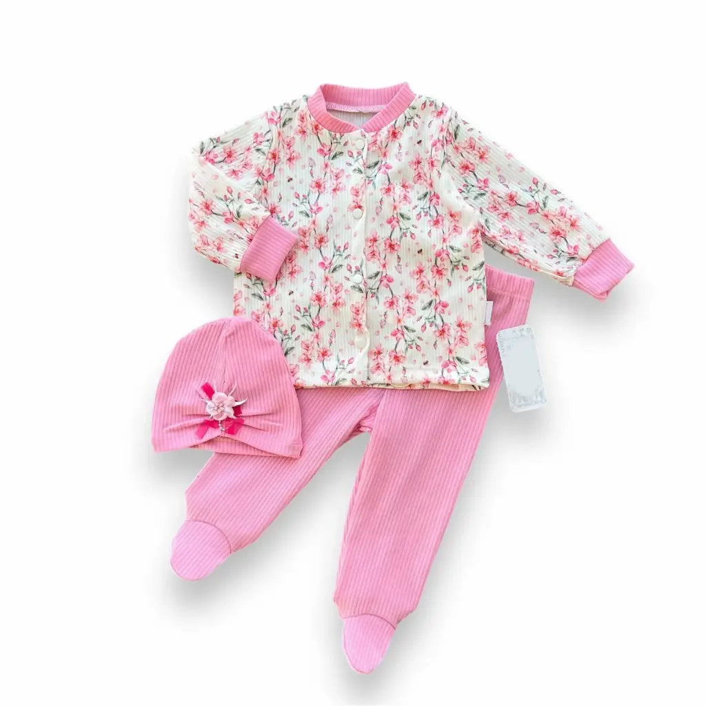 3-6-9-12 Ay Çiçek Baskılı Şapkalı Çıtçıt Kapamalı Patikli 3lü Kız Bebek Takımı