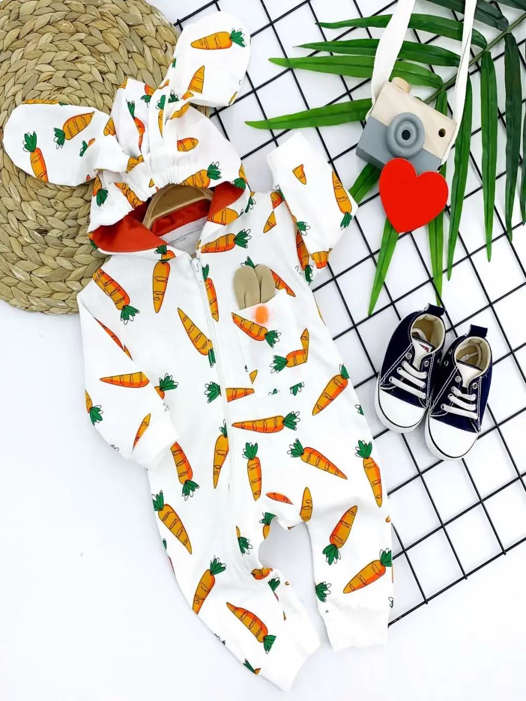 3-6-9-12 Ay Kulaklı Kapşonlu Havuç Baskılı Uzun Kollu Kız Erkek Bebek Tulumu