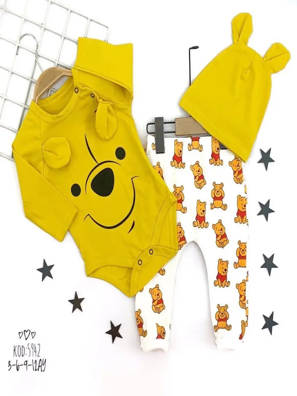 Omarı Sevimli Pooh Baskılı Bebek Takımı Sarı Renkli