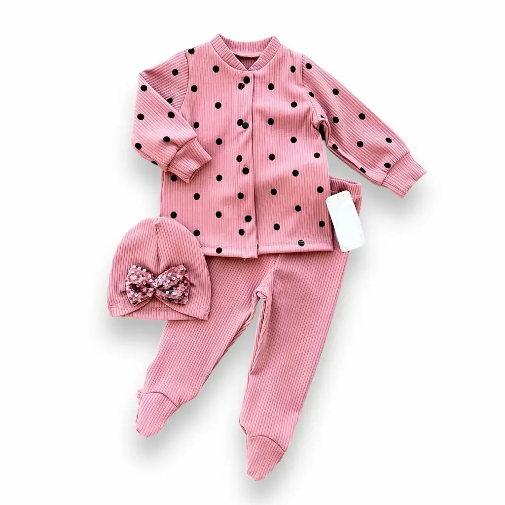 3-6-9-12 Ay Puantiyeli Şapkalı Çıtçıt Kapamalı Patikli 3lü Kız Bebek Takımı